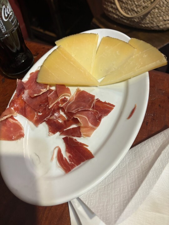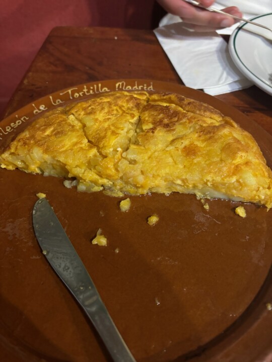 Com o objetivo de eventualmente almoçarmos, fomos caminhando calmamente, passando pela Porta de Alcalá, onde estavam a ensaiar para um desfile, pela Plaza Mayor e pelo Mercado de São Miguel que estava a abarrotar. Entretanto paramos no restaurante Maison de la Tortilla. Ui que delícia de tortilla. Pedimos também uns cogumelos, um chouriço e uma tábua de queijo e presunto que estavam muito bons. A entrada do restaurante não é nada apelativa nem chamativa, no entanto, tem ainda algumas mesas nas traseiras. Entrem, e perguntem se tem mesa, pois pela entrada vão achar que não há mais nada para trás.