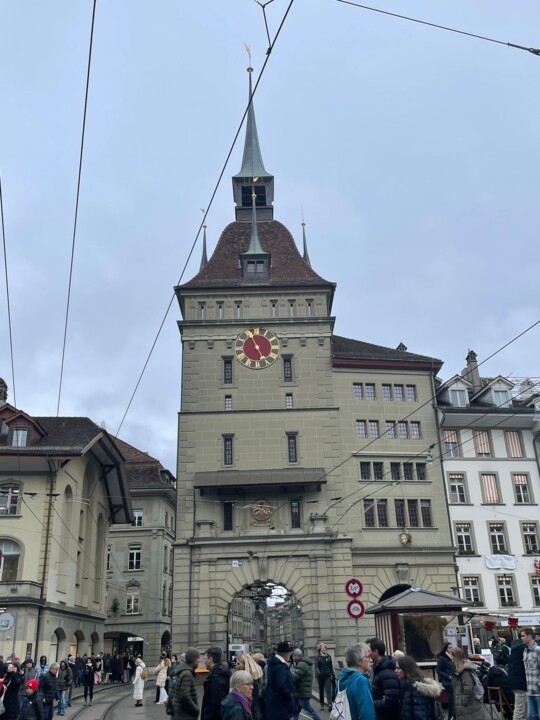 Apreciamos as vistas, tiramos umas fotos e continuamos o nosso passeio em direção ao Zytglogge, uma torre com um relógio. Às horas certas, quando o relógio toca, figuras mecânicas, incluindo um desfile de ursos, um bobo da corte, um galo de ouro e Cronos, o Deus do tempo, encantam os visitantes. Na verdade, não chegamos a ver este mini espectáculo.